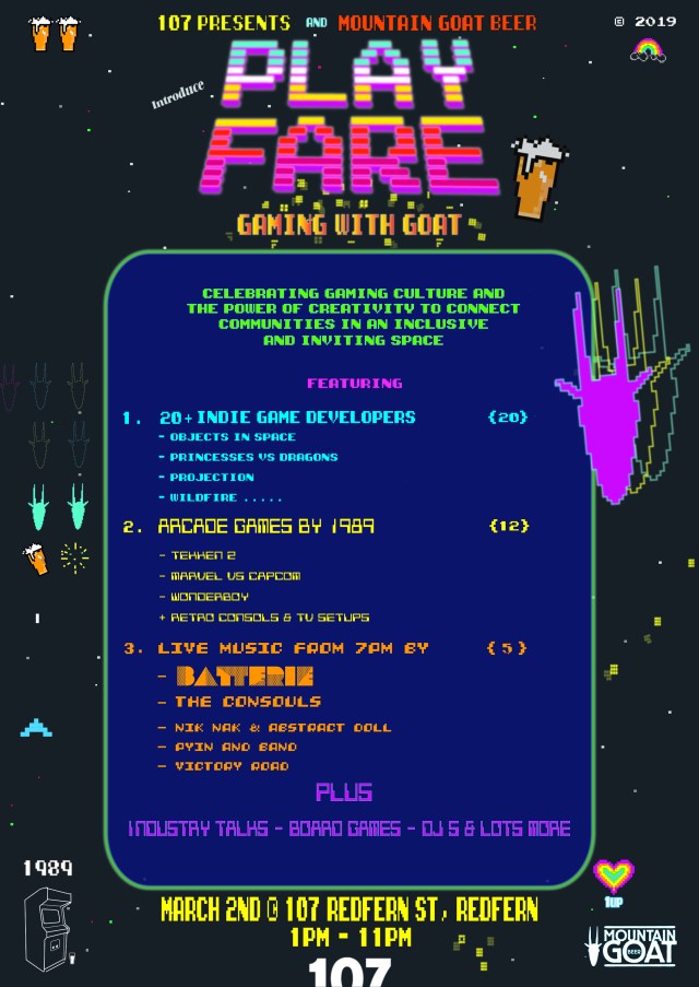 Its an all day/night mini Gaming festival. An event that celebrates indie gaming culture and gaming community in Sydney.I had the pleasure of curating the live music acts. Myself and the 107 team have been working on this program for months. Its going to be so much fun !